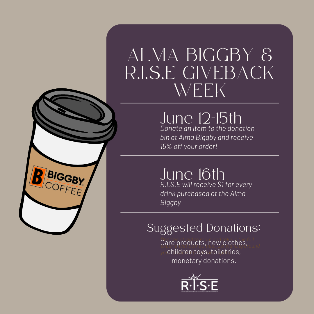 Biggby in Alma is hosting a Giveback Week for R.I.S.E. June 12-16! June 12-15th, donate an item to the donation bin at Alma Biggby and receive 15% off your order! […]